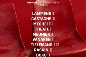 比利时首发:1-拉门斯、21-卡斯塔涅、4-梅切勒、3-泰特、15-穆尼耶、20-瓦纳肯、8-蒂莱曼斯、23-拉什金、11-多库、22-萨勒马科尔斯、17-德凯特拉雷